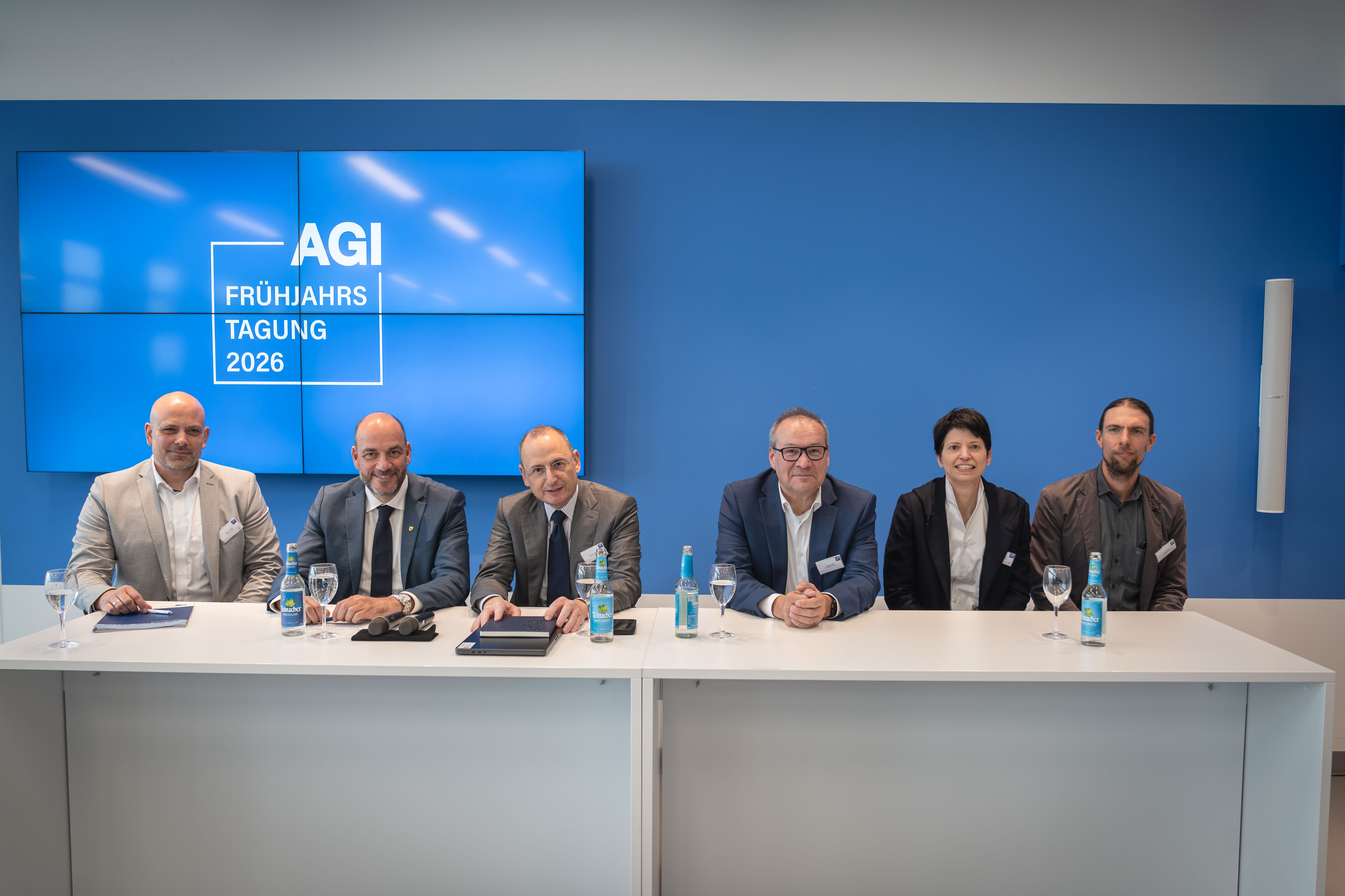 AGI-Vorstandsvorsitzender Oliver Bongarts, ANDREAS STIHL AG & Co. KG, AGI-Vorstand Max Gölkel, IGG Gölkel GmbH & Co. KG, AGI-Vorstand Till Sunderkötter, Dr. Ing. h.c. F. Porsche AG und AGI-Geschäftsführerin Melanie Meinig begrüßten die zahlreichen Teilnehmer aus dem Studio der IGG Gölkel GmbH & Co. KG.
